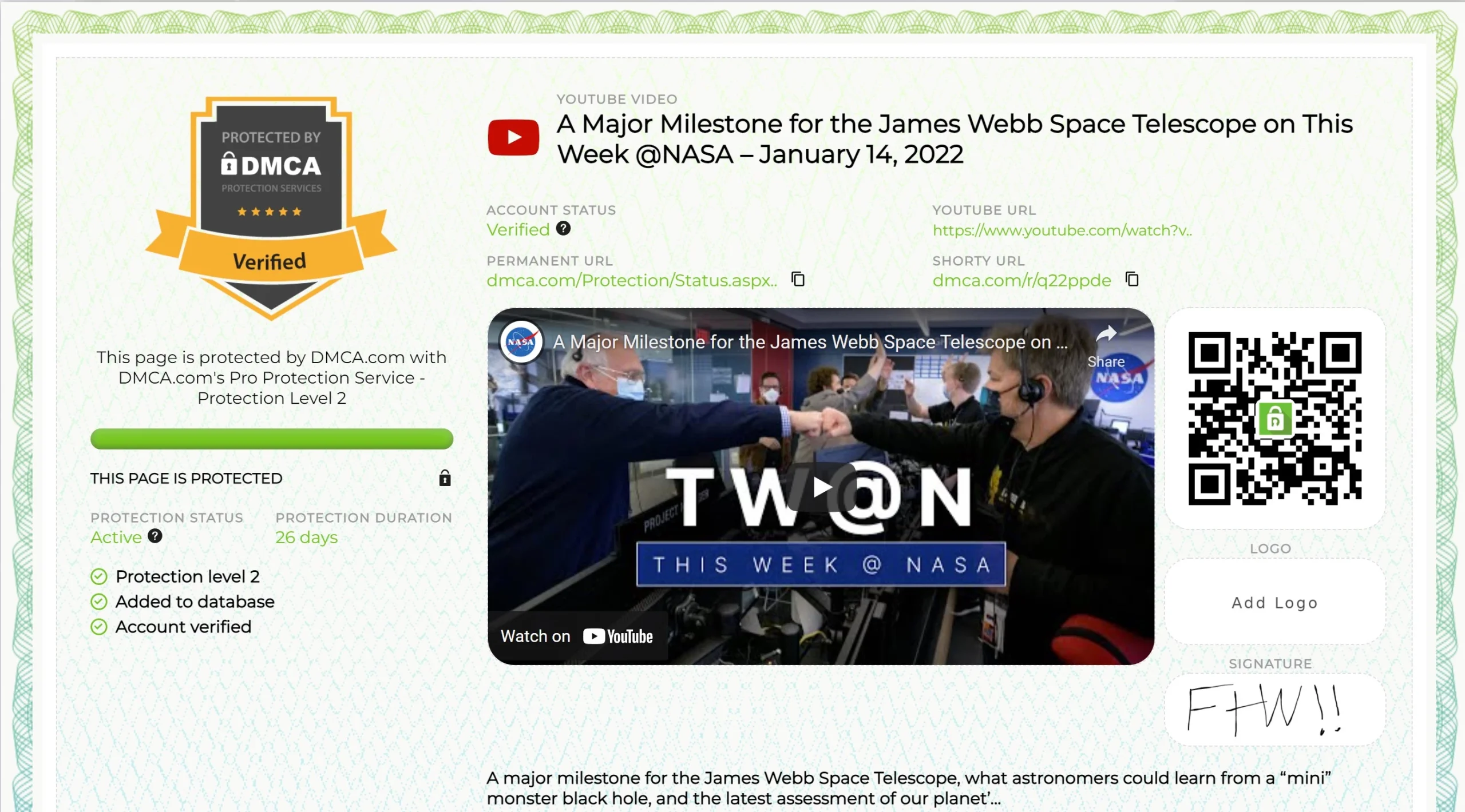 • Protection Certificate provided: even though there is no badge you can still see every one of your website pages’ DMCAtoday.com Protection Certificate by URL.